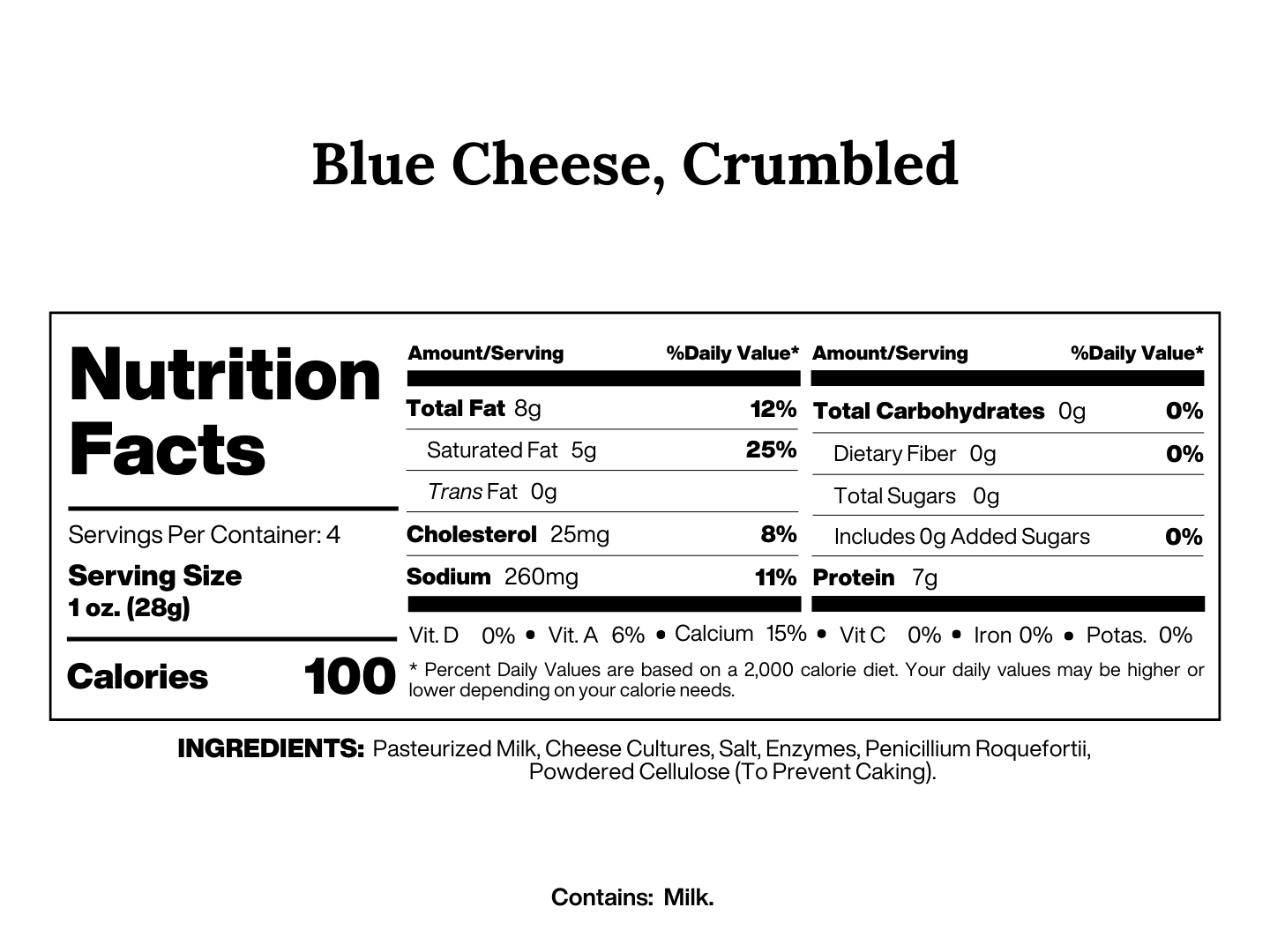 Ingredients: Pasteurized Milk, Cheese Cultures, Salt, Enzymes, Penicillium Roquefortii, Powdered Cellulose (To Prevent Caking).