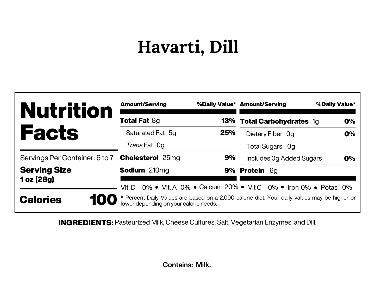 Ingredients: Pasteurized Milk, Cheese Cultures, Salt, Vegetarian Enzymes, and Dill.