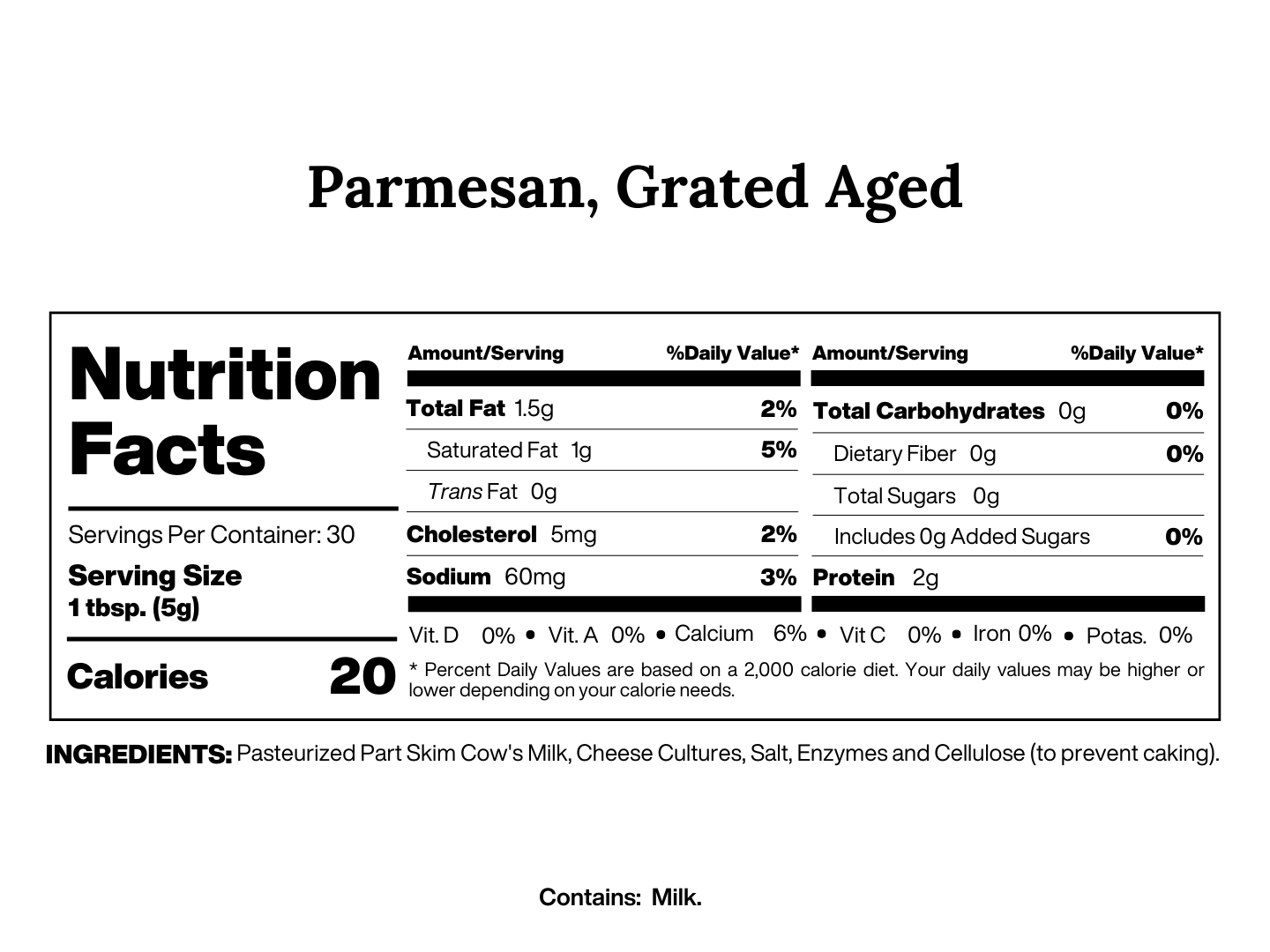Ingredients: Pasteurized Milk, Cheese Cultures, Salt, Enzymes and Cellulose (to prevent caking).