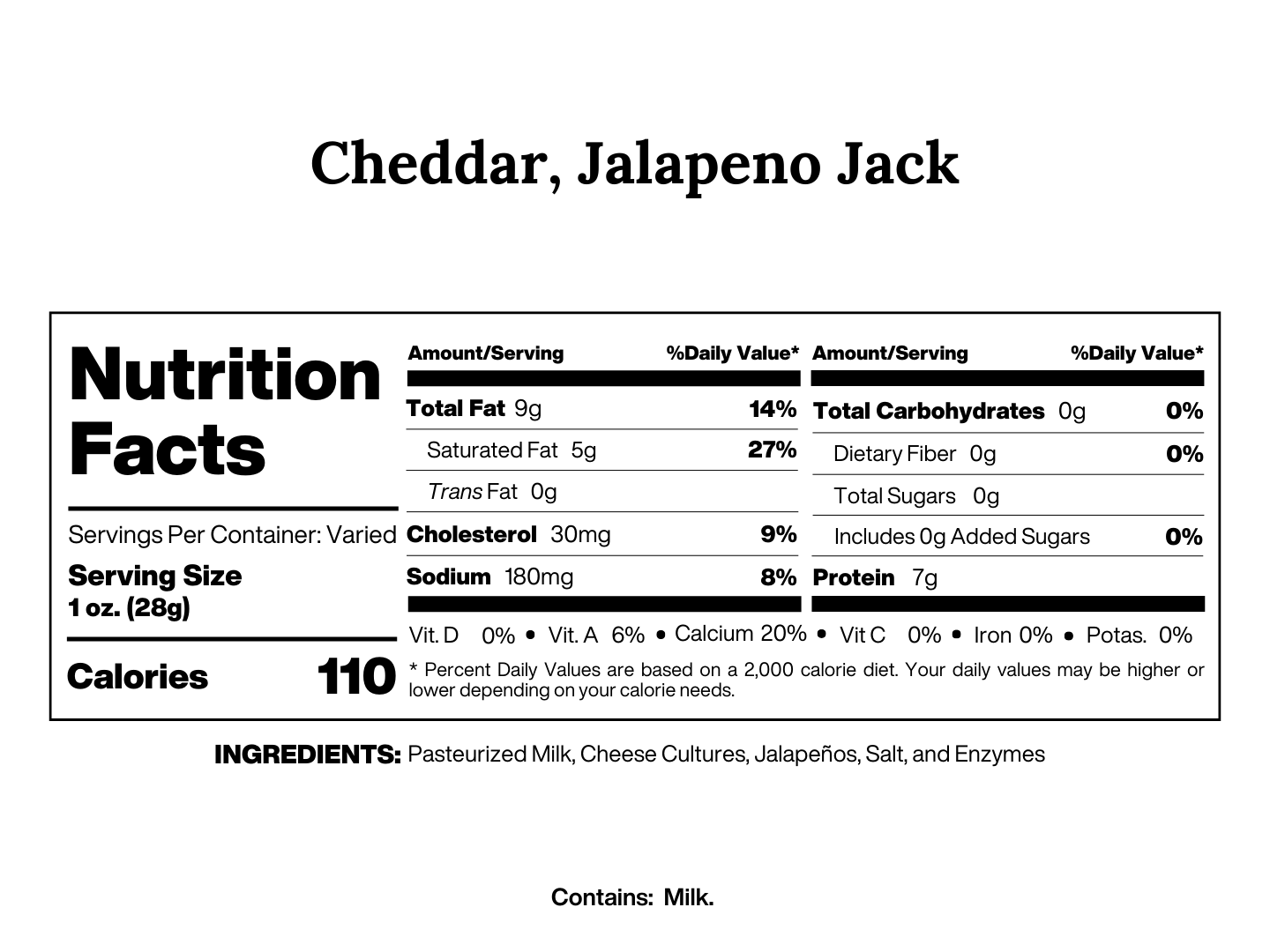 Ingredients: Pasteurized Milk, Cheese Cultures, Jalapeños, Salt, and Enzymes