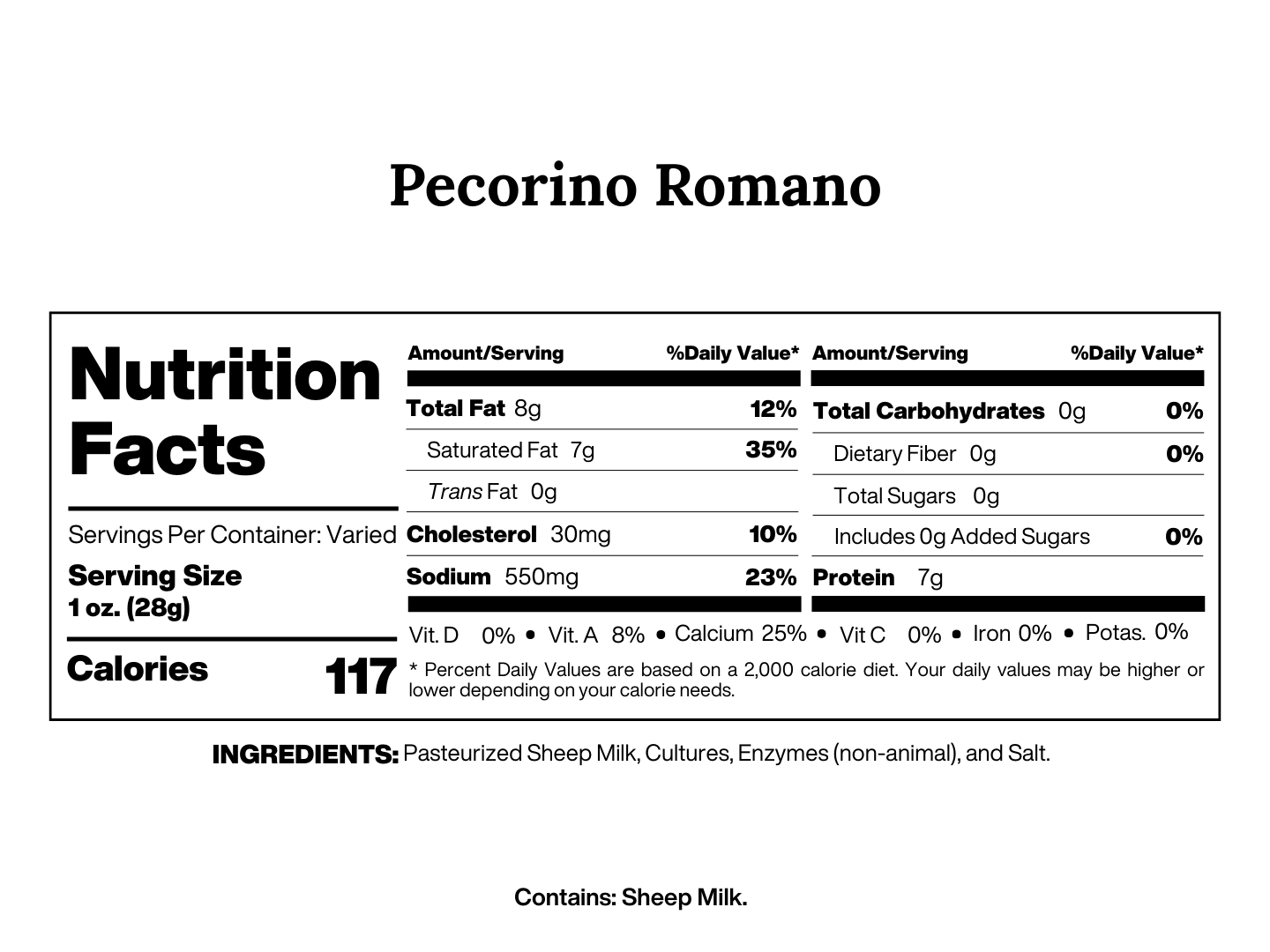 The Craft: Our artisanal Pecorino Romano sheep's milk cheese is aged between 12-24 months to develop its signature sharp, salty, strong flavor notes. Crafted from organic milk sourced from grass-fed sheep in the pastures of Sardinia, Italy, use to shred over pasta or vegetables, or pair with the sweet chestnut honey or strawberry jam.