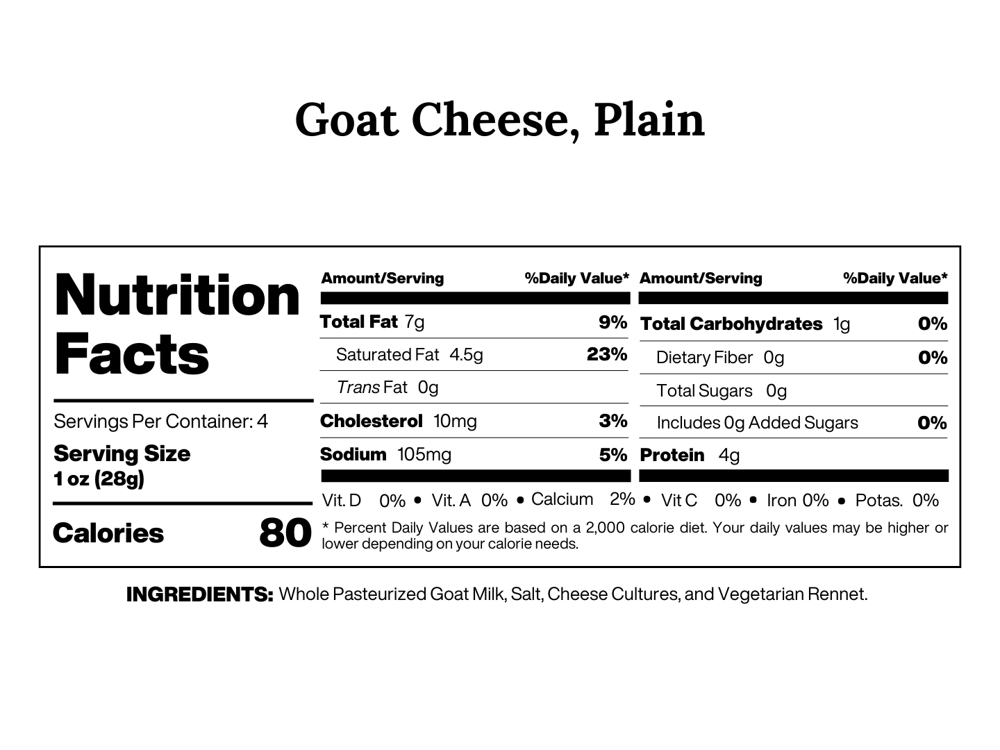 Ingredients: Whole Pasteurized Goat Milk, Salt, Cheese Cultures, and Vegetarian Rennet.